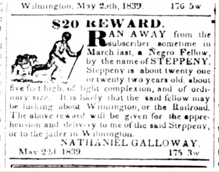 Advertisement announcing reward for runaway slave, Wilmington Advertiser, May 24, 1839. Courtesy of the North Carolina Runaway Slave Advertisements database.