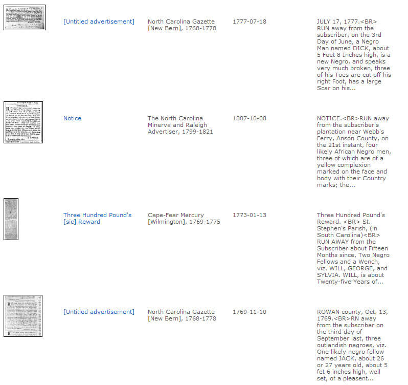The University of North Carolina at Greensboro (UNCG) and North Carolina Agricultural and Technical State University (NC A&T) have launched the North Carolina Runaway Slave Advertisements project, a database of all known runaway slave ads in North Carolina newspapers between 1751 and 1840. With its comprehensive focus, the project is a useful resource for scholars and students interested in the history of slavery and resistance. In addition to scanned advertisements, the database includes transcripts and rich metadata for easy querying of the approximately 2400 ads. Additonally, project staff have provided some brief historical context for researchers. Samantha Winer, a digitization and transcription assistant, writes that this project offers, "insight not only into conditions and lifestyles experienced by the slaves but also into the plantation economy."1Samantha Winer, "A brief history of slavery in North Carolina," North Carolina Runaway Slave Advertisements, 1751–1840, http://libcdm1.uncg.edu/cdm/history/collection/RAS.