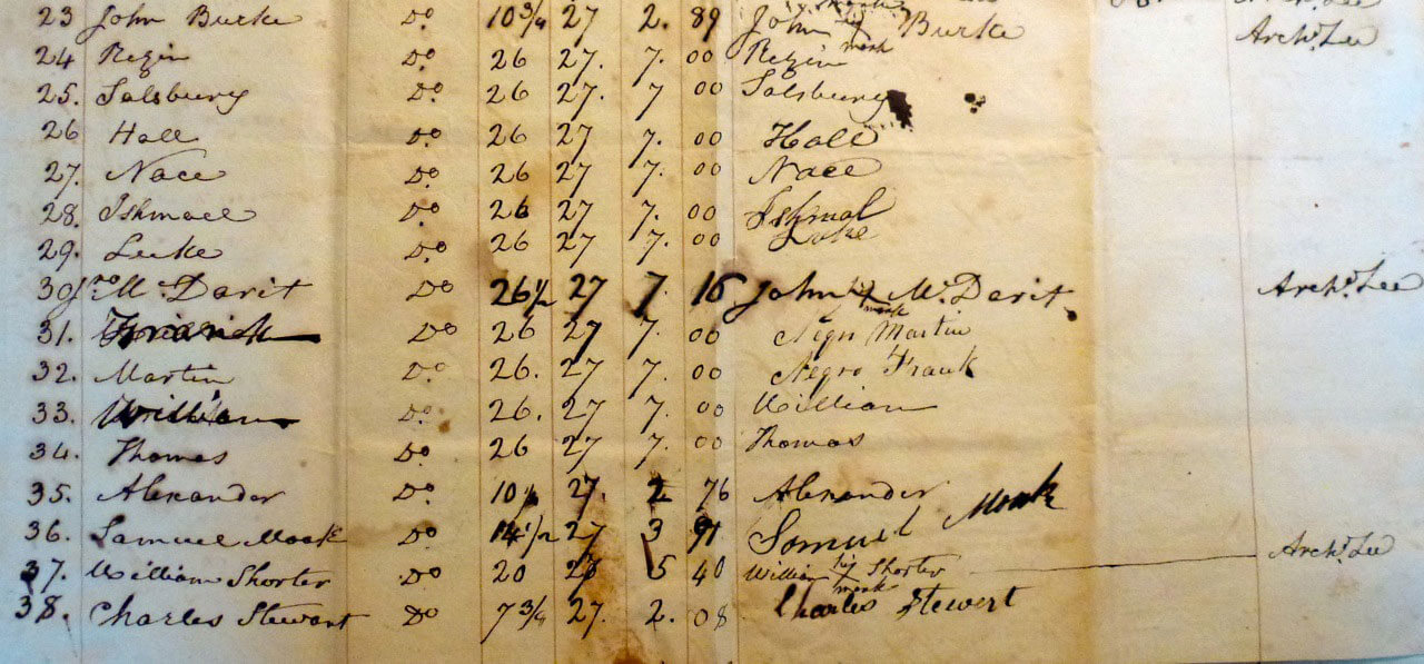 The most remarkable part of the 1823 payroll is the annotation by Frank and Martin (see image, lines 31 and 32). Whoever signed for their pay signed their names as "Negro Martin" and "Negro Frank." These men were almost certainly slaves. Adding these two together with the three "Boys," you have at least five slaves working on the project—and possibly many more. In fact, a majority of workers for this project may have been slaves.1National Archives & Records Administration, Records Group 42: Records of the Office of Public Buildings and Public Parks of the National Capital, 1790–1992. The ARC Identifier is 3025595, MLR Number A1 18.