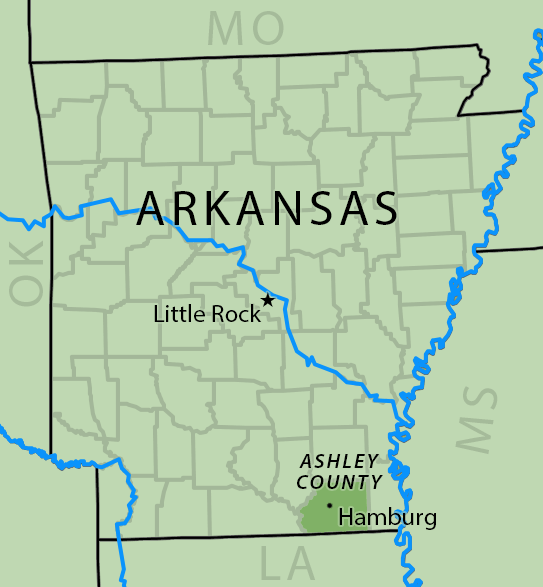 Map of the Ark-La-Miss Borders. The Martins grew up in the town of Hamburg in Ashley County, Arkansas. Map by Southern Spaces.