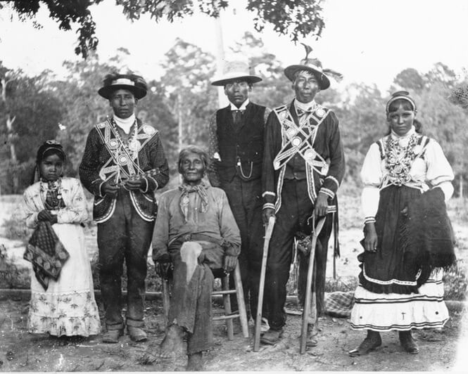 Group of Choctaw men, a young woman and a young girl posed outdoors, probably at a stick ball game, Neshoba County and Scott County, Mississippi, 1908. Photograph by Mark Raymond Harrington. Courtesy of the National Museum of the American Indian, Mississippi Choctaw Collection, N02667.
