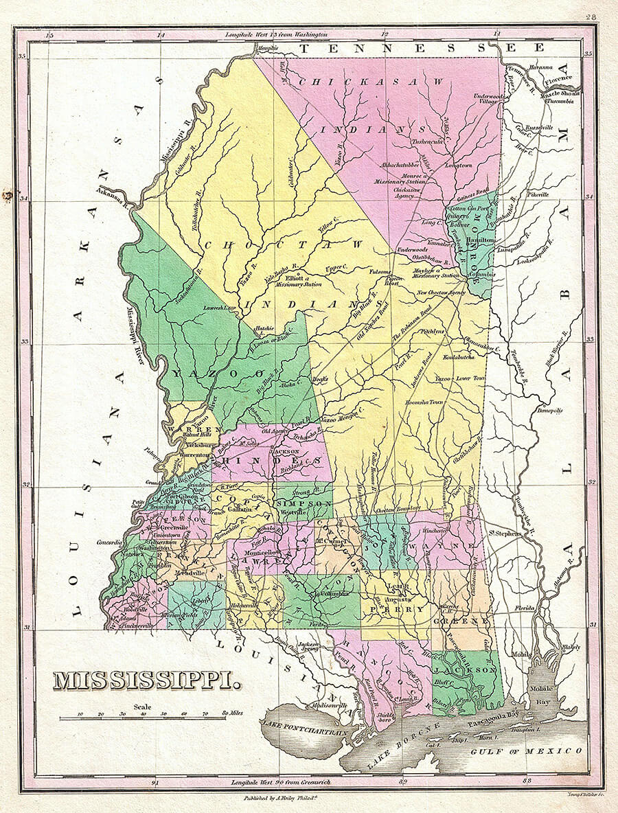 The 1827 Anthony Finley Map of Mississippi depicts the extent of the Choctaw nation in the state. It is featured on the cover of Osburn's book. Photograph by Geographicus Rare Antique Maps. Courtesy of Wikimedia Commons.