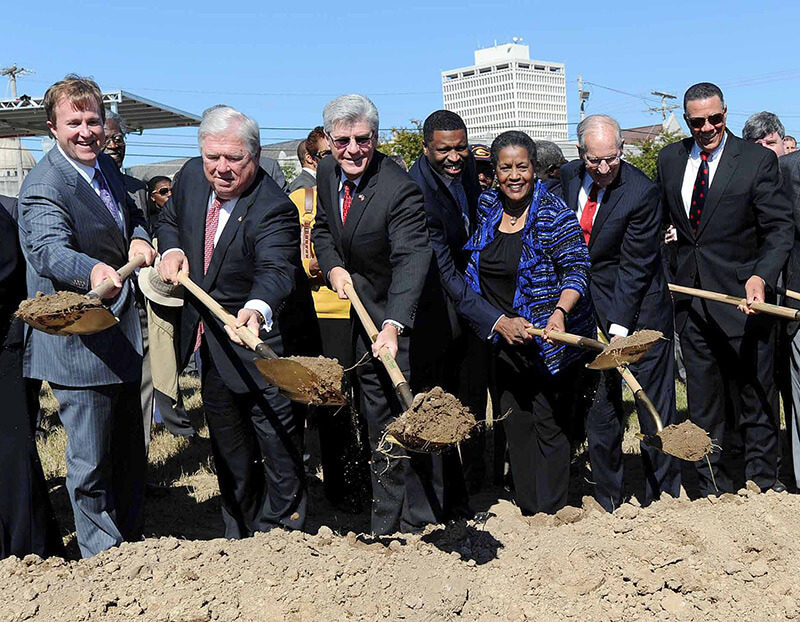 Breaking ground on the Mississippi History and Civil Rights Museums, October 24, 2013. Included in the shovel line, from left, are Entergy Mississippi president Haley Fisackerly, former Governor Haley Barbour, Governor Phil Bryant, state NAACP president Derrick Johnson, former NAACP chair Myrlie Evers, former Governor William Winter, and former state Supreme Court Justice Reuben Anderson. Photograph courtesy of Mississippi Department of Archives and History.