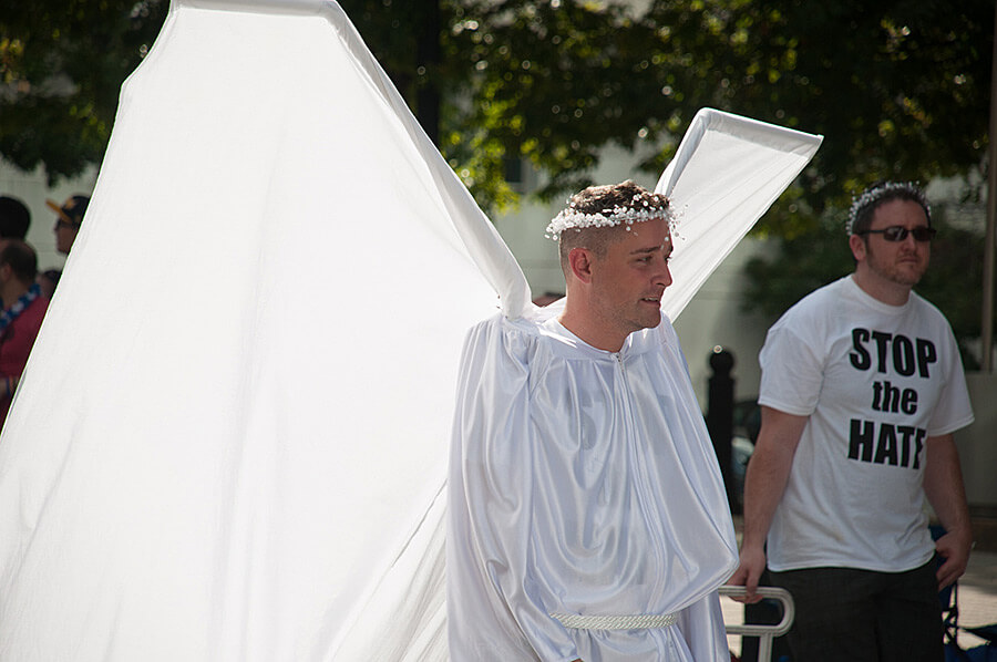 Stop the Hate. Bedsheet Angels march in the 2013 Atlanta Gay Pride Parade. Photograph by Nick Mickolas. Courtesy of Nick Mickolas.