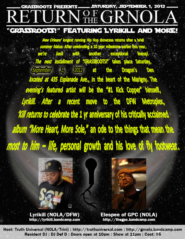 GRASSROOTS! flyer advertising September 1, 2012 show with Lyrikill and Elespee.