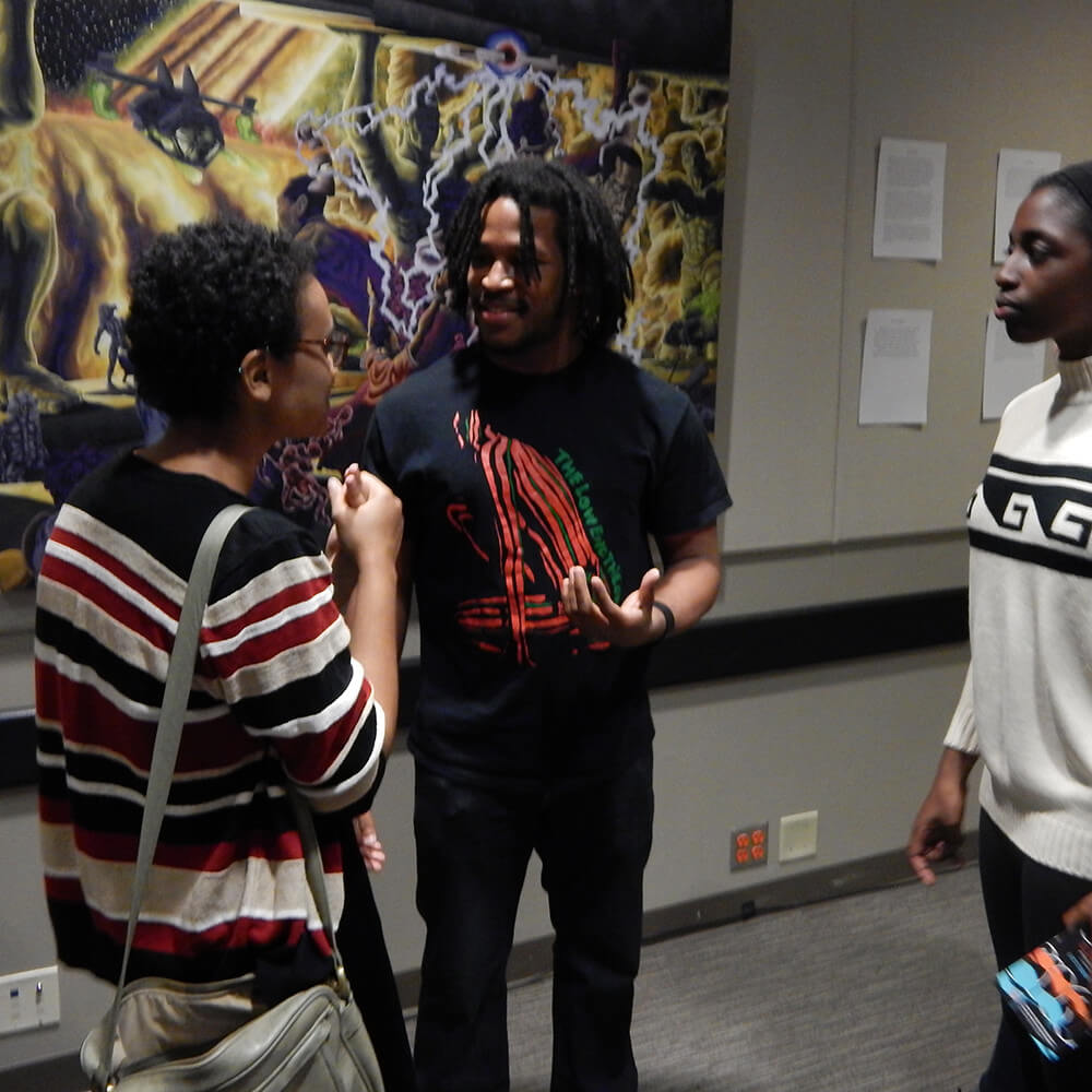 LiFT artist Tim Short discusses his artwork with two event attendees, Gallery 72, Atlanta, Georgia, October 18, 2015. Photograph by Clint Fluker. Courtesy of LiFT Art Salon.