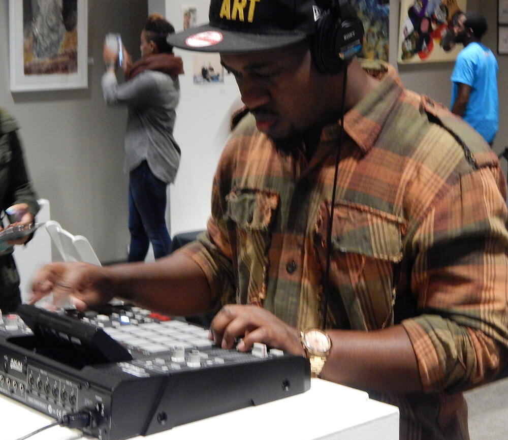LiFT attendee Mikey P interacts with a series of beat machines from different eras of hip hop, Gallery 72, Atlanta, Georgia, October 18, 2015. Photograph by Clint Fluker. Courtesy of LiFT Art Salon.
