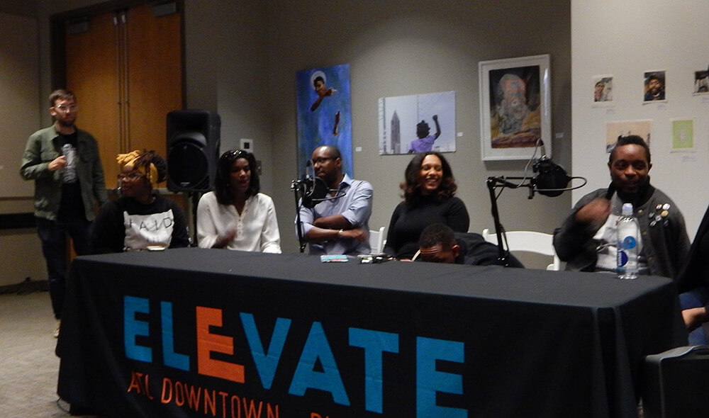 Building on Pecou’s vision, LiFT’s ELEVATE event, "The South Got Something to Say," featured hip hop in a multi-media environment that engaged artists, activists, and academics in dialogue about innovative Atlanta projects.2 "The South Got Something to Say" refers to Andree 3000's acceptance speech at the 1995 Source Awards. "Outkast winning Best New Rap Group at the Source Awards 1995," YouTube video, 5:36, posted by The Max Trailers, October 12, 2014, https://www.youtube.com/watch?v=vwLG7aSYM3w. Held in Gallery 72, attendees enjoyed a visual art exhibit featuring Atlanta-inspired pieces by the LiFT art collective3The LiFT art Collective consists of six young artists who contribute orginal art to the LiFT Art salon each month. The collective includes, Gerald Lovell, Julian Plowden, Doriane Sewell, Jurell Cayetano, Tim Short and Annisa Wedderburn. and graffiti artist SKIE, a live musical performance by local rap artists Jack Preston and Small Eyez, and a salon-style dialogue between the LiFT team and Digital Good Times on racial dynamics in Atlanta’s technology scene. Together, these events introduced Gallery 72 as a vibrant canvas to a new audience.