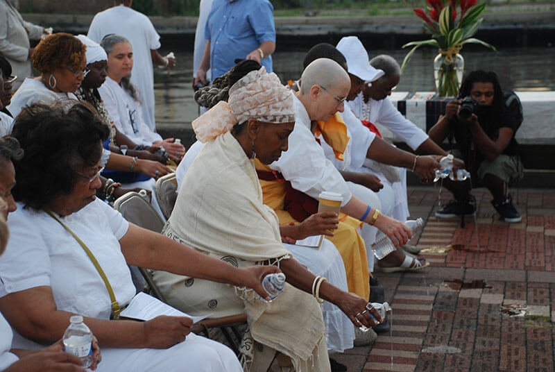 Fells Point, Broadway Pier, Baltimore, Maryland, 2012 (The first ceremony sponsored by MPCPMP). Participants pouring libation to honor African ancestors who experienced the Middle Passage. Photograph by Zora Cobb. Courtesy of MPCPMP.