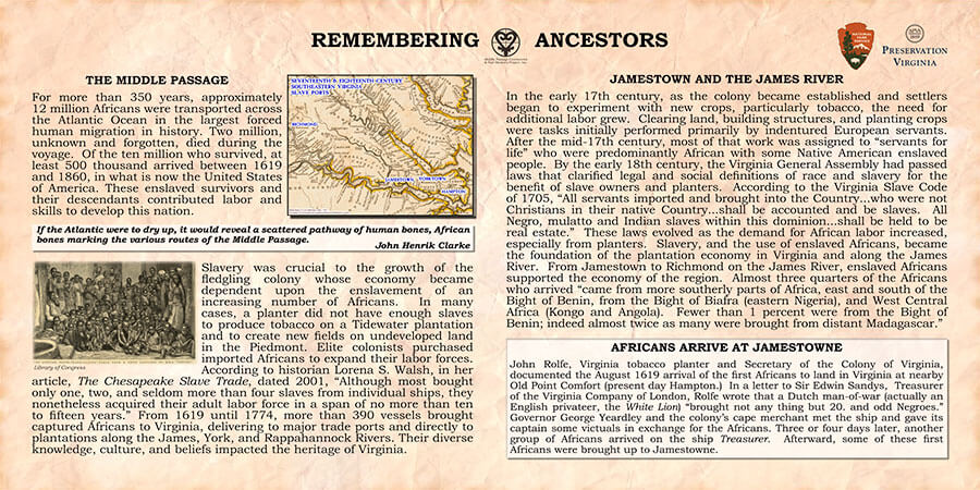 The installation of historic markers at the forty-one Middle Passage arrival ports publicly designates these places as crucial points where the lives of European and African people intersected to form what would become the United States. In some cases, this has required a reassessment of the popular narrative and perceptions. For instance, Jamestown, Virginia, which is routinely identified in schoolbooks as the place where Africans first arrived in North America, is neither the actual place of Africans' first arrival in Virginia (Point Comfort, Hampton, Virginia, is the actual site) or in North America (Florida holds that distinction). Residents of Fredericksburg, Virginia, long identified with the domestic human trade, recently learned, after MPCPMP presented Eltis's research from the Voyages Database, that their city was a Middle Passage port on the Rappahannock River.2Further study by a National Park Service historian reviewing data from the New York Historical Society provided more detail to support this "new" site definition.