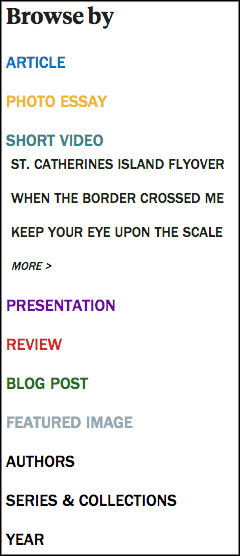 Our new site's design embraces a streamlined, minimal aesthetic uncommon in digital scholarly journal publishing but increasingly popular among long-form web magazines. Our home page highlights a rotating array of new and featured publications, followed by a scrolling list of the journal's publications, organized chronologically. A book icon at the top of the page (also present just to the left of the Southern Spaces logo across the new site) reveals a side menu offering ways to browse the journal's content organized by publication type, author, series/collection, or year of publication. Individual publication pages foreground accessibility through larger, more legible text and heading, improved navigation through an always visible expandable section menu, screen-reader friendly semantic markup, and a single-column design that minimizes distracting clutter and increases the proportion of the page devoted to the publication itself. The site's header, main navigation menu, and search bar disappear as you scroll down to clear more space for publication content, reappearing if you scroll up for easy access. Like our section menu and social media sharing buttons, it's out of the way but always present if you need it.