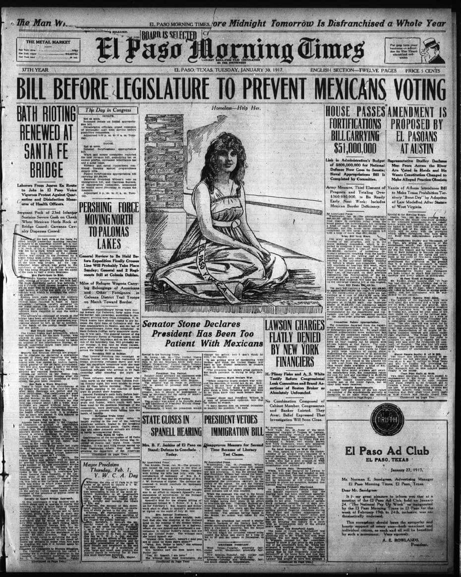 Cover page El Paso Morning Times, El Paso, Texas, January 30, 1917. Courtesy of University of North Texas Libraries Portal to Texas History, texashistory.unt.edu/ark%3A/67531/metapth198631/m1/1/sizes.