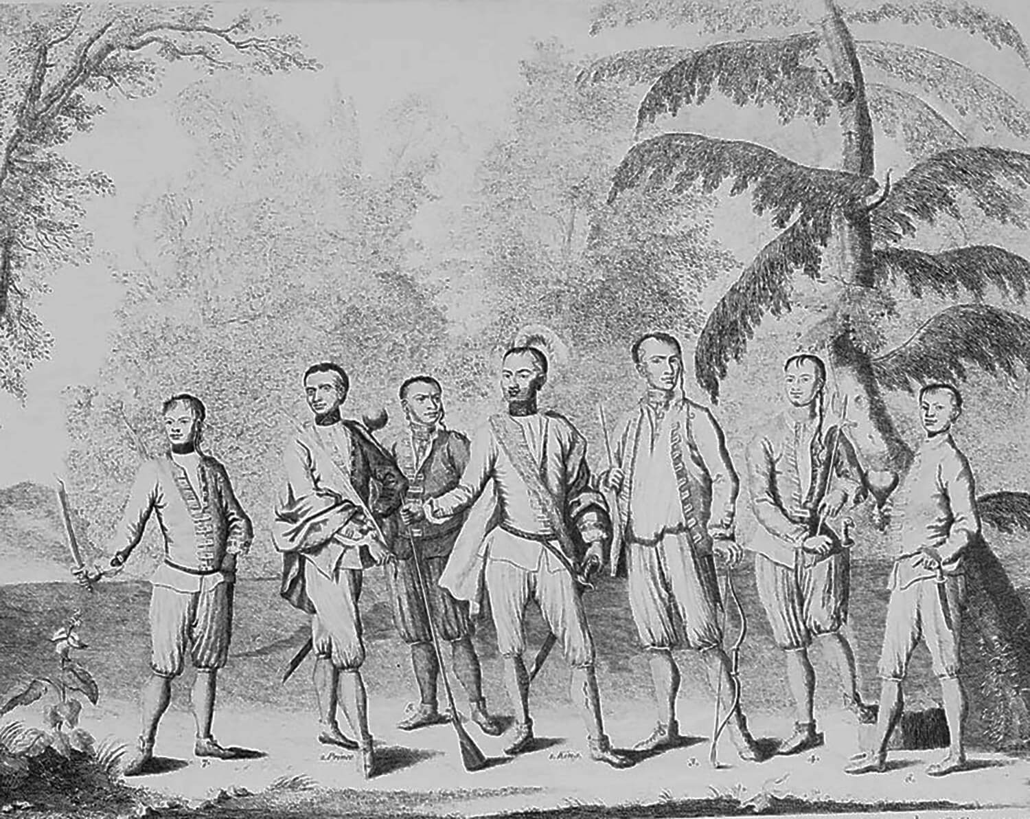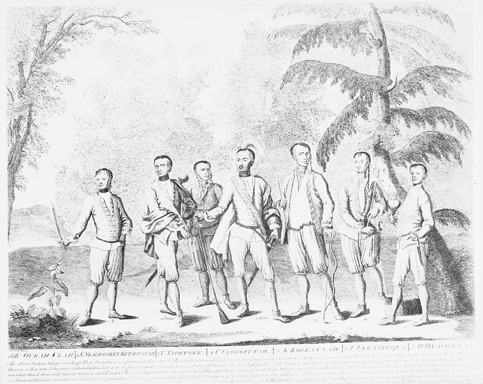 Seven Cherokee chief delegates accompanying Sir Alexander Cumming to London, 1730. These chiefs represented every region in which the Cherokee then lived. Engraving by Isaac Basire. Courtesy of Wikimedia Commons. Engraving is in public domain.