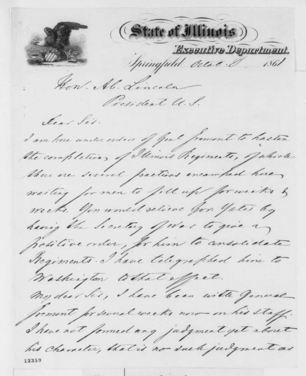 Letter from Gustave P. Koerner to Abraham Lincoln, Springfield, Illinois, October 8, 1861. Courtesy of the Library of Congress Abraham Lincoln Papers, Manuscript Division, memory.loc.gov/cgi-bin/ampage?collId=mal&fileName=mal1/123/1235900/malpage.db&recNum=0.