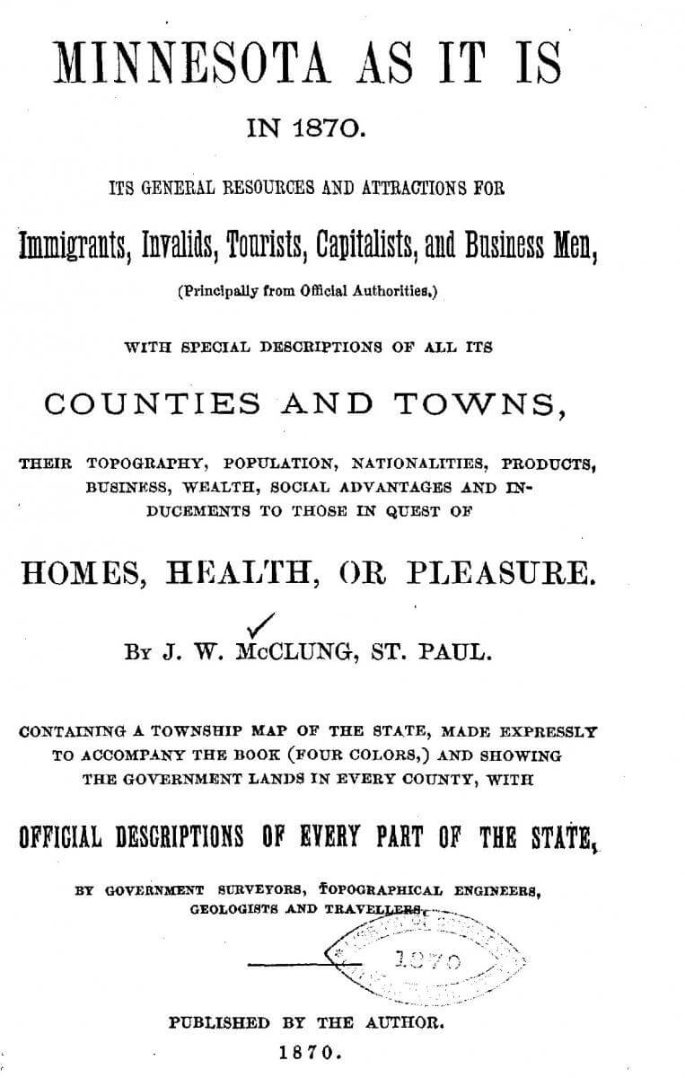 Cover page of J.W. McClung's Minnesota as it is in 1870, (St. Paul, Minnesota, 1870). Courtesy of the Library of Congress General Collections and Rare Book and Special Collections Division, loc.gov/resource/lhbum.01092/?sp=1.
