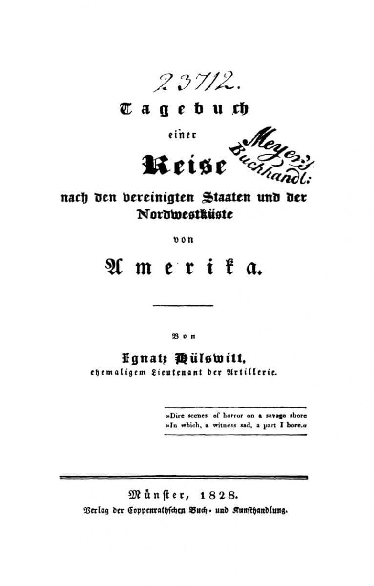 Title page of Ignatz Hülswitt’s Tagebuch einer Reise nach den Vereinigten Staaten und der Nordwestküste von Amerika, (Münster, Germany: Coppenrathschen Buch und Kunsthandlung, 1828). Courtesy of Göttinger Digitalisierungszentrum.