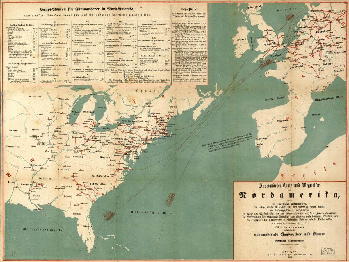 Auswanderer-karte und wegweiser nach Nordamerika, Emigration map and guide to North America, Stuttgart, Germany, 1853. Map by Gotthelf Zimmermann, published by J.B. Metzler'schen Buchhandlung. Courtesy of Library of Congress Geography and Map Division, loc.gov/resource/g3701e.ct000244/.