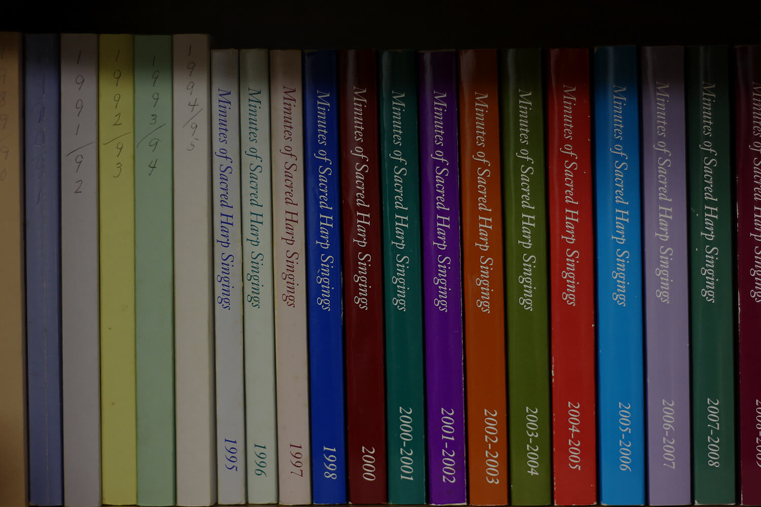 Sacred Harp singing minutes volumes in the collection of the Sacred Harp Museum. Photograph by Jonathon Smith.