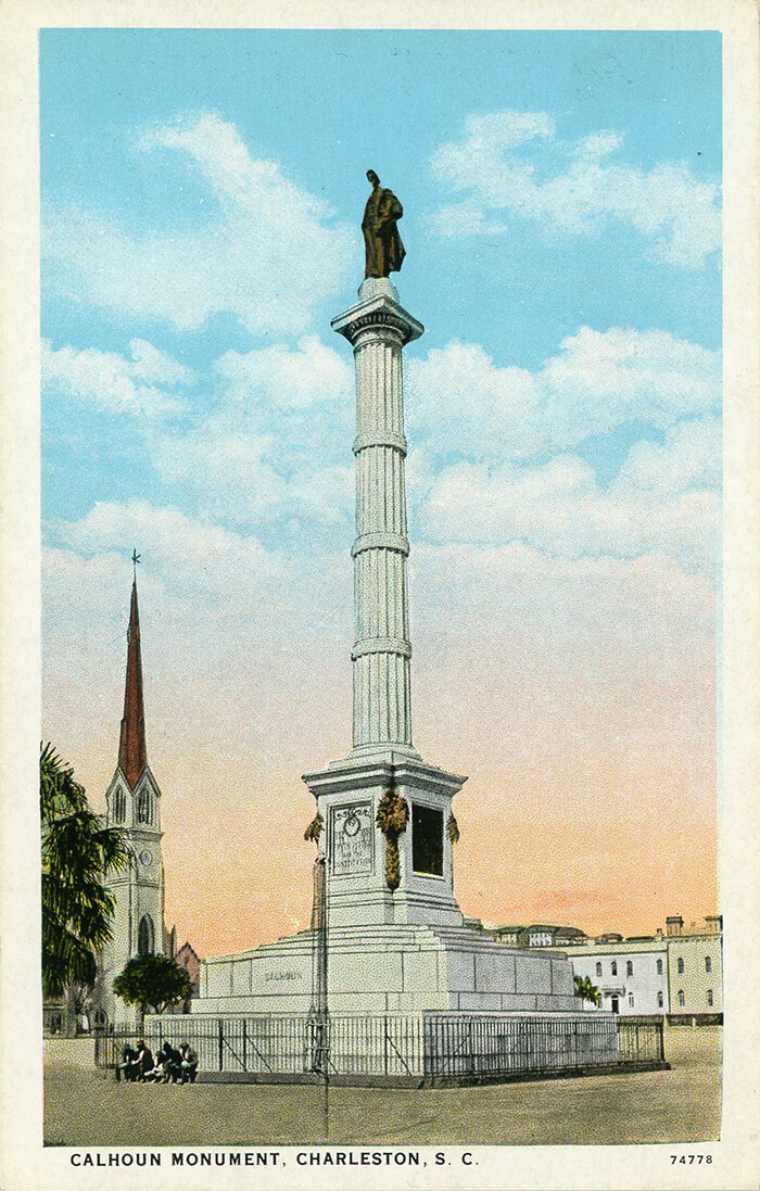 Charleston's antebellum history as the capital of a slave society and a fount of proslavery ideology prefigured the production of white supremacist historical accounts of the "peculiar institution" by its local defenders following the Civil War and throughout the postbellum years. The city's master class, in the decades preceding the war, coalesced around a defense of black enslavement that touted white racial superiority and a belief in slavery's humanitarian benefits. A rising tide of northern abolitionism and mounting concerns about slave insurrection in their immediate environs, most notably the Vesey plot, prompted a shift from the notion that slavery was a "necessary evil." South Carolina senator John C. Calhoun, revered by white Charlestonians, argued in 1837 that slavery was a "positive good" that benefited both masters and slaves (96). White Charlestonians seeking to memorialize Calhoun and pay homage to his beliefs erected two posthumous statues of him, in 1887 and 1896. Calhoun's detractors repeatedly vandalized the first monument, after which a second sculpture was placed on a high pedestal. This challenge and response was a minor skirmish in the long-running and largely one sided contest between historical narratives chronicled in Denmark Vesey's Garden. For generations to come, Calhoun's white supremacist beliefs and Christian paternalistic ideology regarding slavery persisted in numerous forms and venues in Charleston.