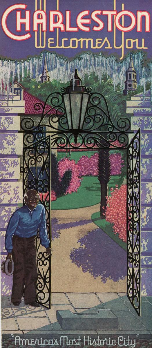 Kytle and Roberts inventory various iterations of the dominant slavery narrative and provide valuable details that include microhistories of the "artisans of different kinds" who in large part controlled the historical production process.1Michel-Rolph Trouillot, Silencing the Past: Power and the Production of History (Boston, MA: Beacon Press, 1995), 25, 96. Trouillot, in his historiographical analysis of silencing the past, uses the term "artisans of different kinds" to refer to narrators other than professional historians whose historical accounts "augment, deflect, or reorganize the work of the professionals." These artisans, among them "politicians, students, fiction writers, [and] filmmakers," figure prominently in the production of dominant historical narratives and the perpetuation of historical silences, such as erasures or banalizations of slave rebellions in Haiti and elsewhere. Among the narrators and their versions: Confederate veterans and local white politicians whose Lost Cause narratives discounted the importance of slavery as a cause of the Civil War and posited that emancipation would have been inevitable regardless of the conflict; United Daughters of the Confederacy officers and members whose instructional materials for school children described chattel slavery as a benevolent system of caring masters and devoted servants; Charleston boosters in the 1930s whose tourist brochures for "America's Most Historic City" featured an elderly black man on its cover, hat in hand, opening a wrought-iron gate accompanied by text that omitted any mention of enslaved people; and the all-white Society for the Preservation of Spirituals, whose members had been "reared under the plantation traditions" and whose public performances and interpretations of African American spirituals as late as the mid-1950s served to perpetuate the trope of the faithful and contented slave (204).