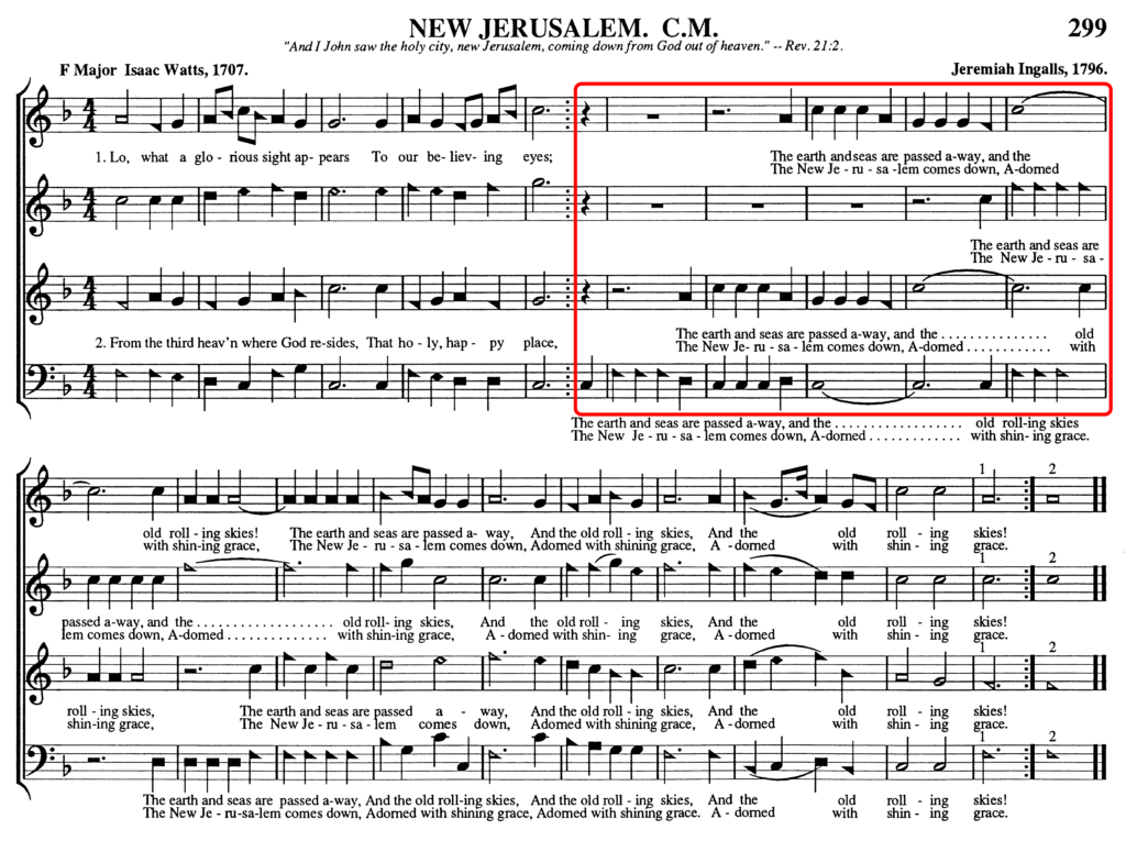 Many of the songs in The Sacred Harp leverage specific features of the hollow square for musical and emotional impact. The three immersive recordings of the Sacred Harp singing at Mt. Lebanon feature songs exemplifying two such approaches: fuging among the voice parts and traded high notes between the tenor and treble parts. Fuging tunes are among the most characteristic and popular song forms in The Sacred Harp. Typical fuging tunes begin with all the parts singing together, followed by a section in which each of the four voice parts enters in sequence, finally coming together again before the conclusion of the song.7Irving Lowens, "The Origins of the American Fuging Tune," Journal of the American Musicological Society 6, no. 1 (April 1, 1953): 46, https://doi.org/10.2307/829998. On fuging tunes, see also Karl Kroeger, American Fuging-Tunes, 1770–1820: A Descriptive Catalog (Westport, CT: Greenwood Press, 1994); Maxine Ann Fawcett-Yeske, "The Fuging Tune in America, 1770–1820: An Analytical Study" (PhD diss., University of Colorado at Boulder, 1997); Jesse P. Karlsberg, "Genre Spanning in the Close and Dispersed Harmony Shape-Note Songs of Sidney Whitfield Denson and Orin Adolphus Parris," American Music 35, no. 1 (2017): 94–132. The most common of these entrance patterns, as found in Jeremiah Ingalls's "New Jerusalem," led by Eli Hinton of Atlanta, Georgia, is propelled forward not just by the cascade of entrances and their progression from lower to higher voices, but by their spatialization. The entrance pattern proceeds counterclockwise around the hollow square, with basses followed by tenors, trebles, and altos.8"New Jerusalem," music by Jeremiah Ingalls (1796), words by Isaac Watts (1707), in McGraw et al., The Sacred Harp, 299.