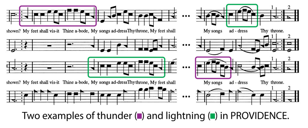 Composers also rely on the separation of vocal parts to create moments of power and energy by trading prominent high notes in rapid succession between the tenor and treble parts, a feature that singers often refer to as "thunder and lightning." Since these two parts are typically sung by mixed gender groups with similar vocal ranges, this trading back and forth of high notes would be undetectable without the vocal separation that the hollow square provides. In songs like C. Curtis's "Providence," led here by siblings Wanda Capps and Danny Creel from Dora and Hoover, Alabama, respectively, the traded high notes are distinct and clearly audible, contributing dynamic crackling energy to the song. "Providence" features "thunder and lightning" in multiple places. After a short opening section, the song's chorus begins with the trebles singing a musical phrase that peaks on a high note (accompanied by the basses) which is immediately echoed by the tenors. The song continues with similar exchanges, culminating in a figure ricocheting from the tenor to the treble as the song reaches its conclusion.10"Providence," music by C. Curtis (1820), words by Isaac Watts (1719), in McGraw et al., 298.
