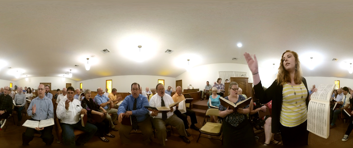 For singers, the hollow square is both a practically necessary convention and a deeply meaningful space. Encircled by full-voiced singing to hymn texts such as Isaac Watts's "Within Thy circling pow'r I stand, On ev'ry side I find Thy hand," for singers the immersiveness of the hollow square comes to represent God's encompassing love.2"Akin," music by P. Dan Brittain (1971), words by Isaac Watts (1719), in Hugh McGraw et al., eds., The Sacred Harp: 1991 Edition (Carrollton, GA: Sacred Harp Publishing Company, 1991), 472. For composers, the spatial organization of singings, especially the separation of voice parts, is something to consider and emphasize in writing for the tradition. For singers and scholars seeking to capture the essence of Sacred Harp singings, the hollow square has been a longstanding focus, with advances in recording technology leading to new strategies. In this publication we introduce new immersive 360-degree video and audio recordings we made from within the hollow square in the summer of 2019 and offer context drawing on a larger project about the hollow square's meaning to singers and composers and the history of attempts to capture the experience of this unique sonic space.