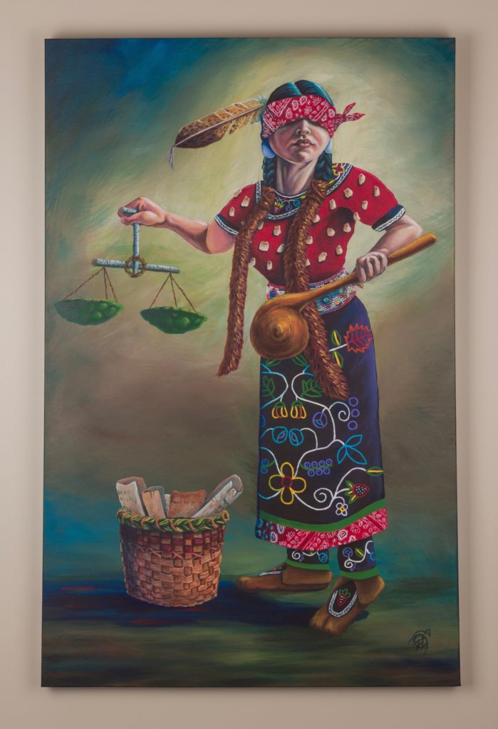 Dibaakonige Kwe, a Native American Lady Justice with a basket of treaties at her feet, 2018. Painting by Alan Compo. Courtesy of Andrew Adams III.