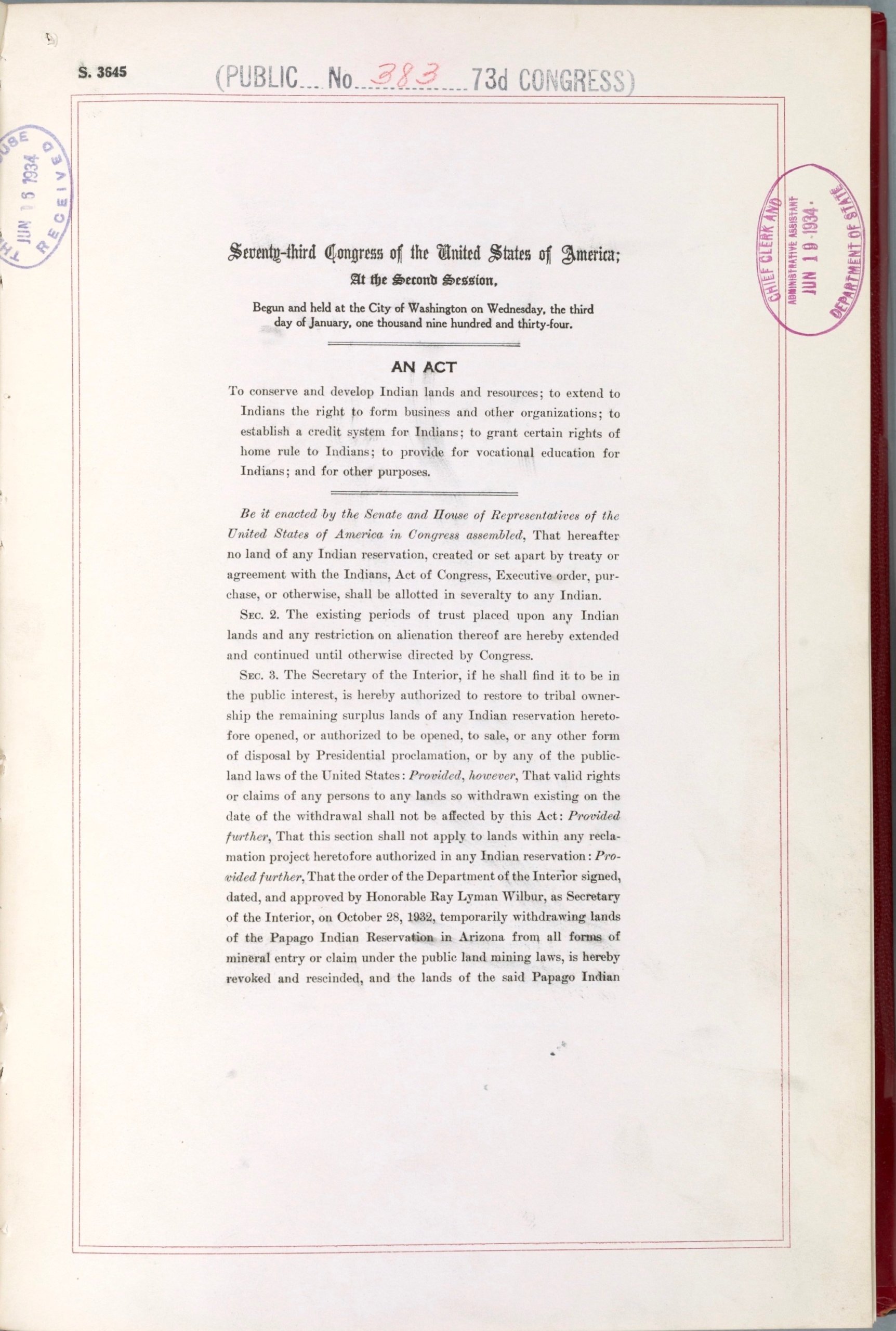 First page of the Indian Reorganization Act of 1934, June 18, 1934. Courtesy of the National Archives, identifier 7873515.