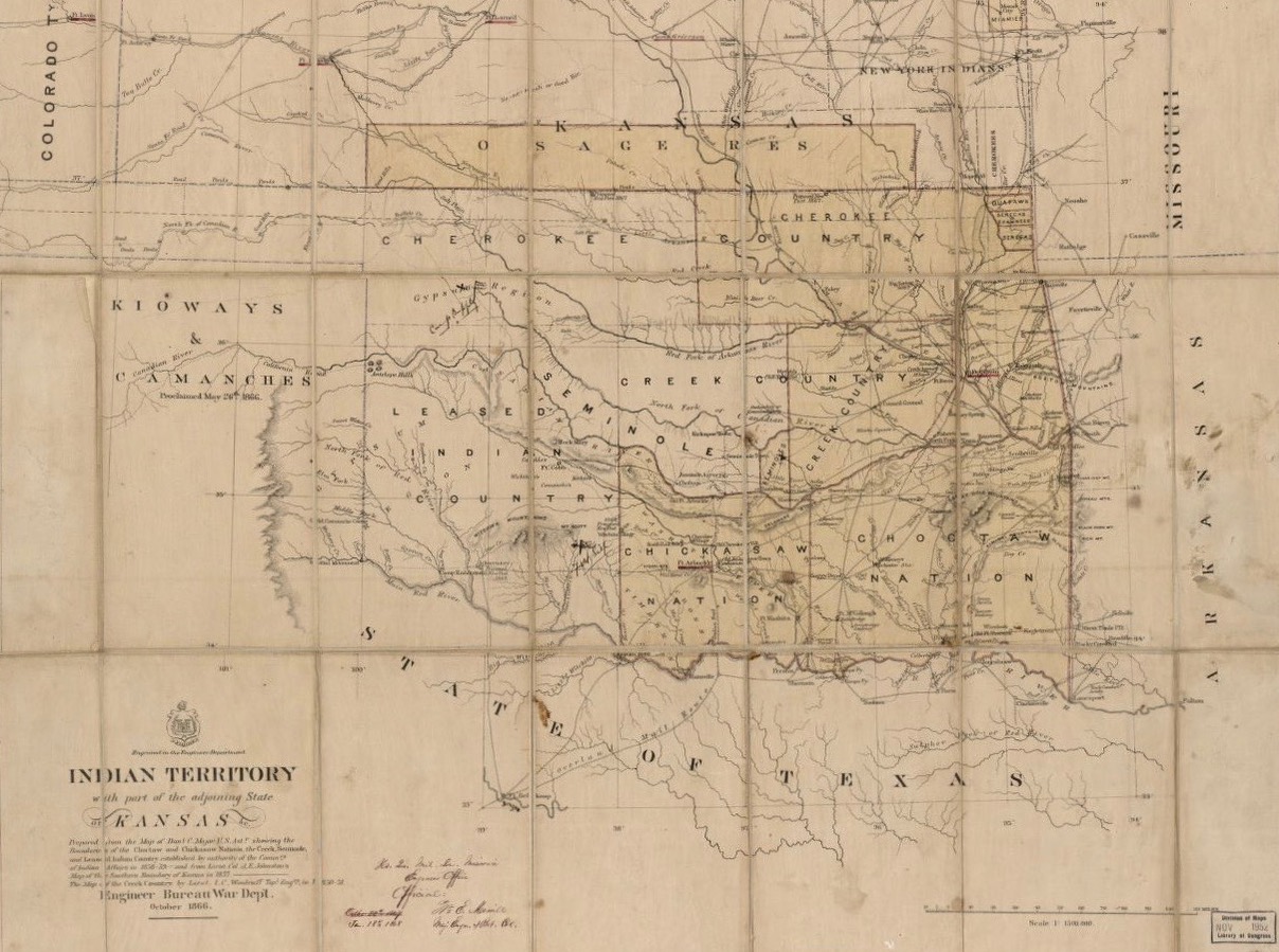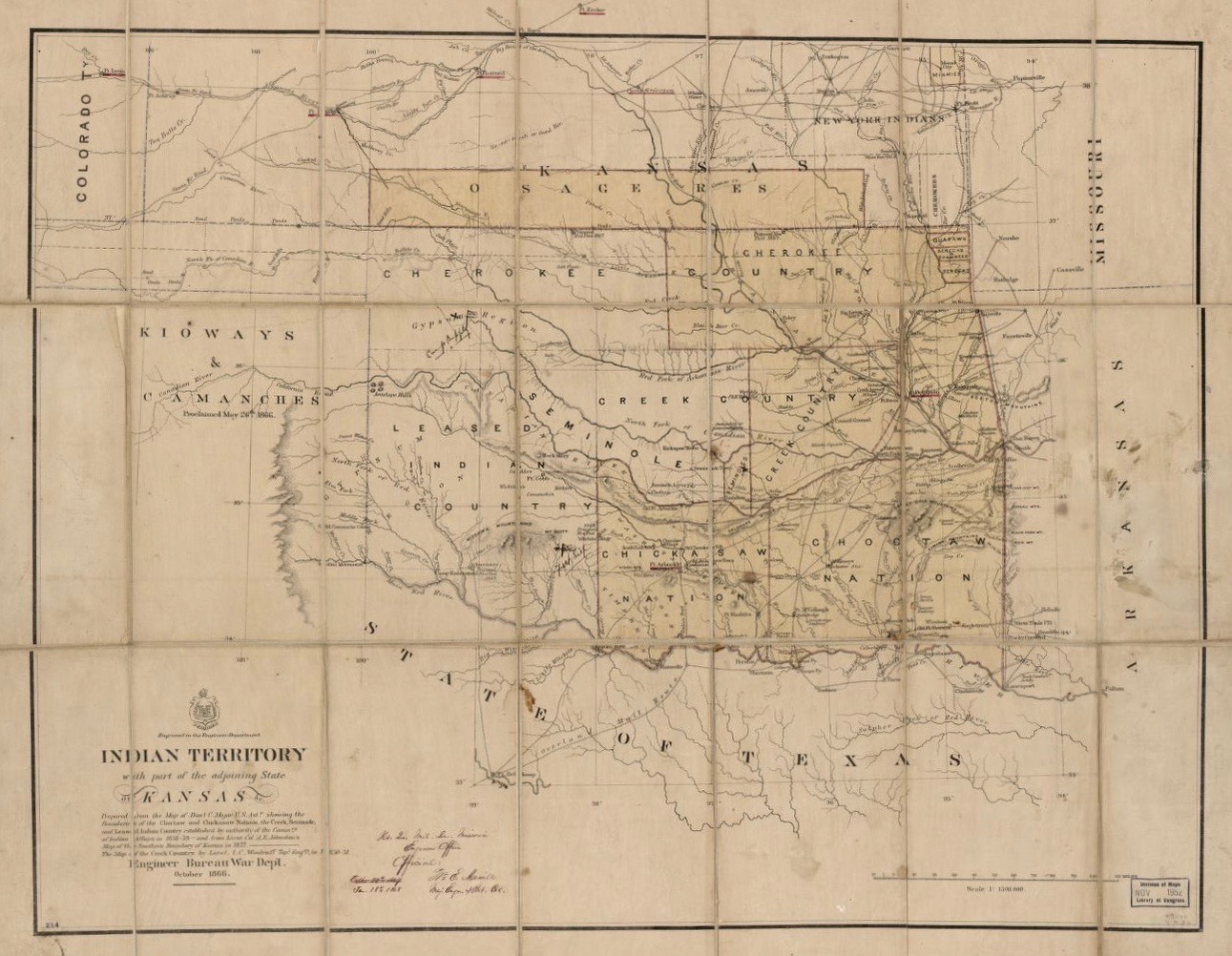 Indian Territory, with part of the adjoining state of Kansas, etc., 1866. Map by United States Army Corps of Topographical Engineers. Courtesy of the Library of Congress Geography and Map Division, loc.gov/item/2011590003/.