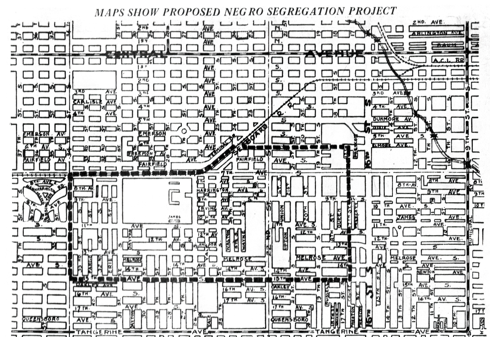 Map of St. Petersburg's proposed segregated neighborhoods, boundaries that were never fully enforceable, yet have shaped race relations then and now, 1935. Image courtesy of Times Publishing Company.