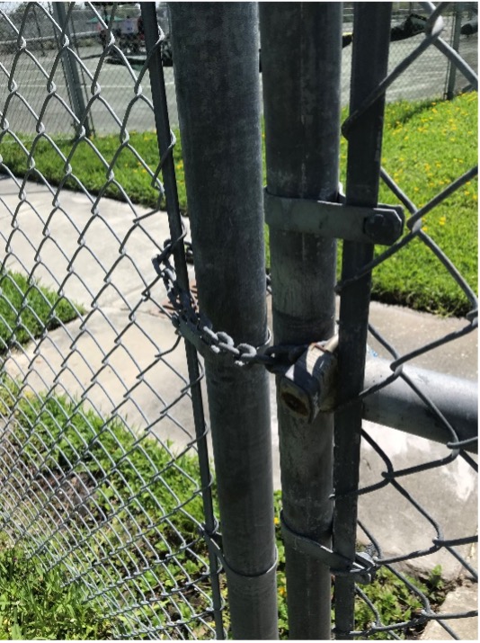 Locked fence gate, blocking the St. Petersburg Tennis Center (a facility mostly used by white people, not from the neighborhood) from the Frank Pierce Recreation Center, which is more frequently used by African Americans in the Bartlett Park community. Photograph by and courtesy of the author.