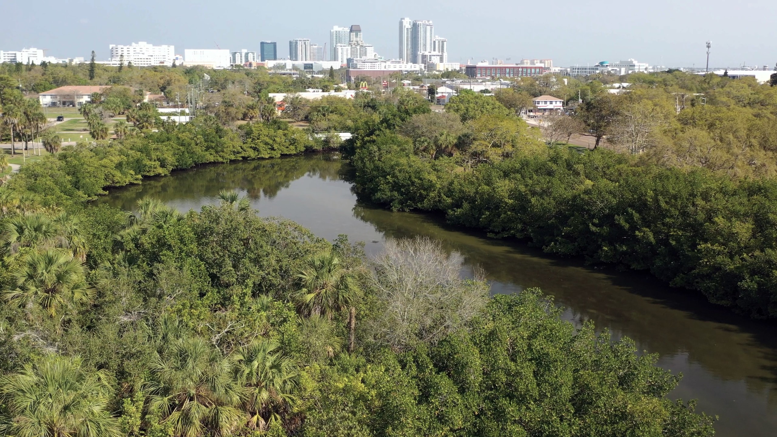 My route takes me roughly halfway to Lake Maggiore, mostly by industrialized lots left abandoned for speculation. Past the Dollar General and McDonalds, I push through the choking mangroves, then slip under another low-slung bridge at Eighteenth Avenue South. From here the creek opens into Bartlett Pond, a small aperture all but choked off due to overgrowth. I have seen snook roil below the black, murky surface. I've also seen a prize game fish, floating ominously on the surface of the muck. Osprey watch from their nests in the light posts by the athletic fields. Were it not for the hum of traffic, I could be in the 10,000 Islands of the Everglades. Instead I have found Nature in the heart of a city.