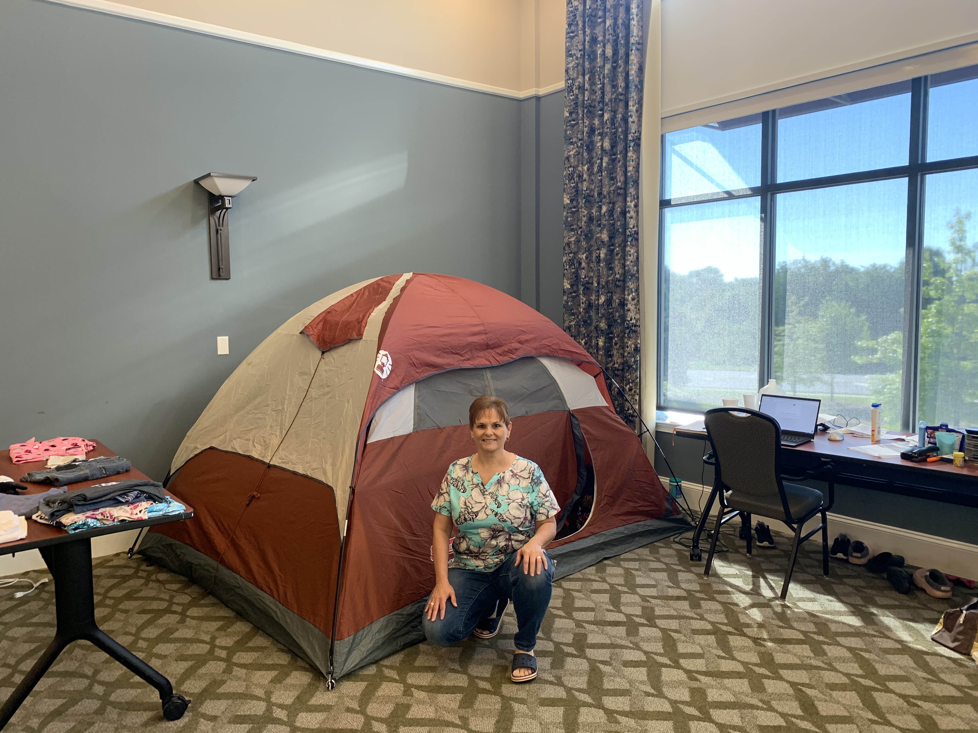 Some of the employees lived in model rooms, some lived in rooms on air mattresses, and some people, like me, lived in our health center, with memory care and skilled nursing. I lived in a tent in the community hall.