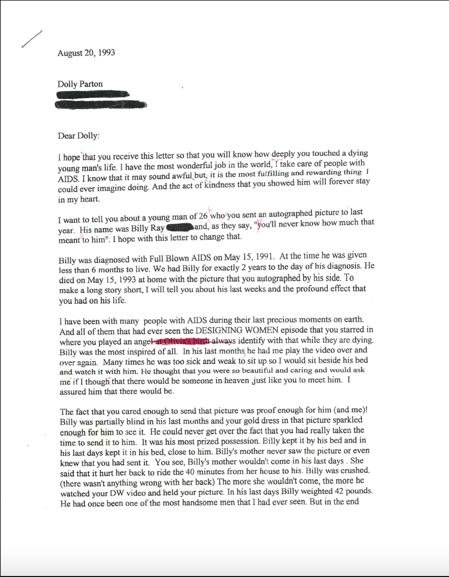 Alongside this parade of neglectful parents, another narrative of idealized mother figures runs through Ruth’s life history and archives. A letter she wrote to Dolly Parton on August 20, 1993, on behalf of Billy Ray Collins soon after he died, fashioned the beloved country music singer as a substitute maternal figure for the dead man. Ruth wrote the letter thanking Dolly for a picture that she had sent to Billy, a devoted fan. “Billy’s mother never saw the picture or even knew that you had sent it,” the letter begins “You see, Billy’s mother wouldn’t come in his last days. . . . Billy was crushed.” Ruth's letter underlined a profound sense of loneliness: “But in the end, even his friends stopped coming by to see him. They just couldn’t take it. His lover, Paul, and I were the only ones there in the last weeks and minutes of his life, except for you.” Ultimately, Ruth had to tell the dying Billy that his mother would not visit him. “I finally told him that his mother wasn’t coming but that I would be there with him as would Paul. And that he would not die alone. All he said was ‘and Dolly’.” In Ruth’s memory of Billy’s final days, recorded in a letter to Parton, a photograph of the singer was transformed into an icon standing in for Billy’s absent mother.36See, Box 6, Folder 16, Ruth Coker Burks papers, Center for Arkansas History and Culture, Little Rock, Arkansas. Billy was certainly not the only one of Ruth’s guys to reach out for their mothers and be denied at the end of their lives. This is a recurring theme in Ruth’s memoir.