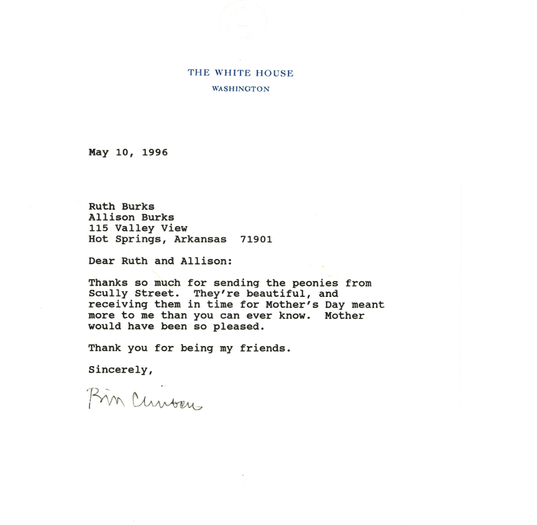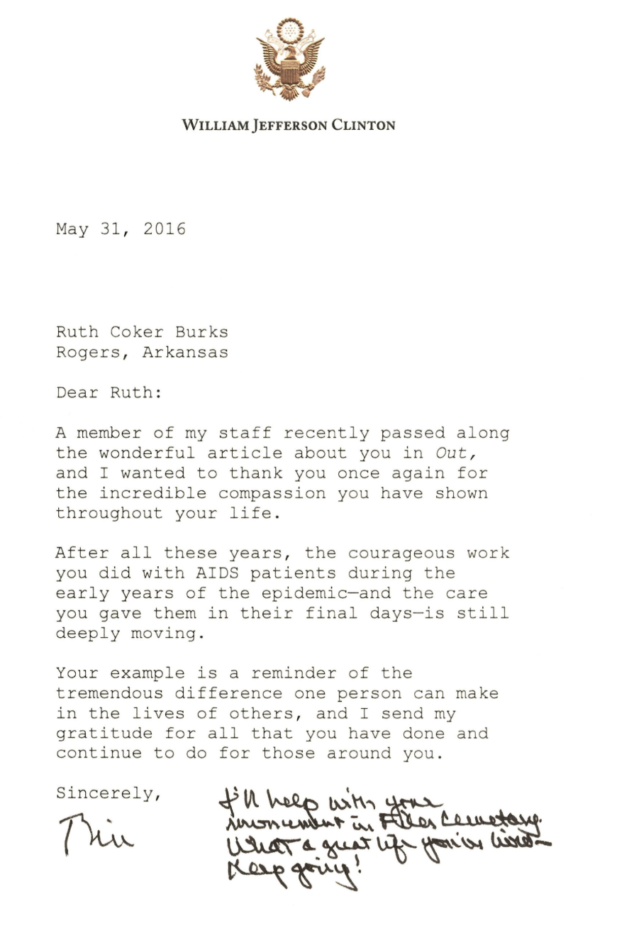 A more recent letter from Bill Clinton to Ruth, May 31, 2016. The handwritten postscript reads: "I'll help with your monument in Files Cemetery. What a great life you've lived—keep going!" Courtesy of the authors and the Center for Arkansas History and Culture.