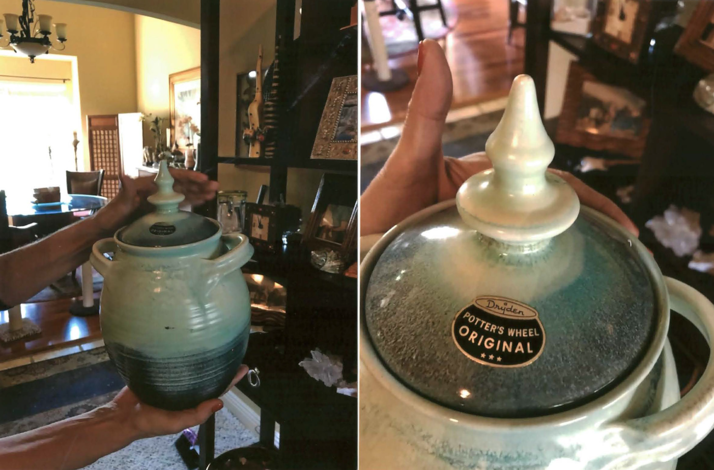 The final, unused Dryden Pottery vessel in Ruth's collection, [approx. date]. Ruth interred the ashes of some of her 'guys' in Dryden pots in Files Cemetery. Photograph courtesy of the authors and the Center for Arkansas History and Culture.