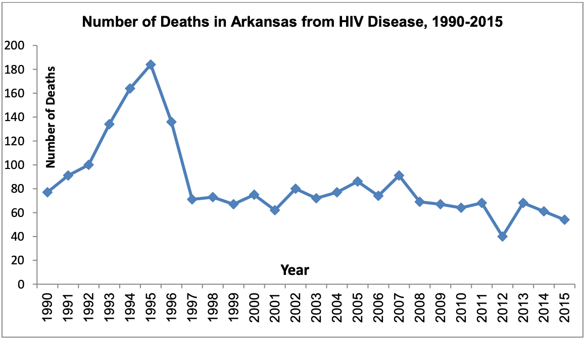 Number of deaths in Arkansas from HIV/AIDS, 1990–2015. Graph from Arkansas HIV/STI Integrated Epidemiologic Profile. Courtesy of Arkansas Department of Public Health.