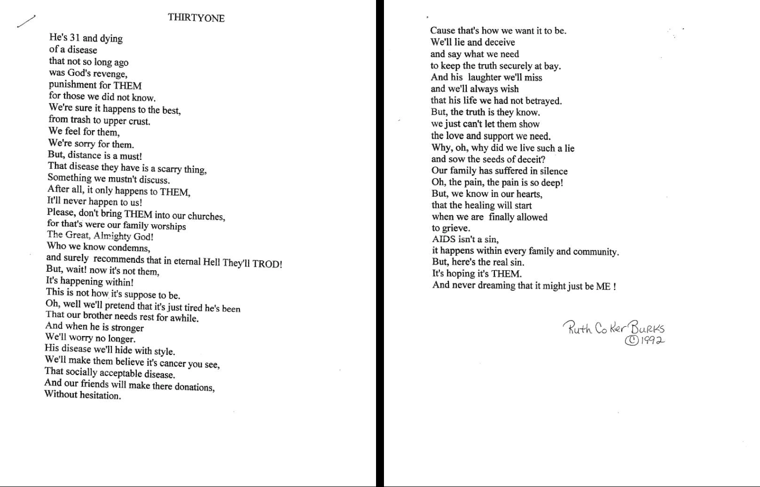 In “THIRTYONE,” the sense of isolation is deployed in anger against society and religious institutions. Ruth writes: “He’s 31 and dying of a disease that not so long ago was God’s revenge, punishment for THEM. While Ruth was sharply critical of the hostility of many religious institutions in Arkansas from the mid-1980s and mid-1990s, she remembers her care work and activism relative to her religious faith. As she has repeated in conversations with us, “I never lost my faith; I just lost faith in everyone else’s faith.”73See, Box 6, Folder 16, Ruth Coker Burks papers, Center for Arkansas History and Culture, Little Rock, Arkansas.