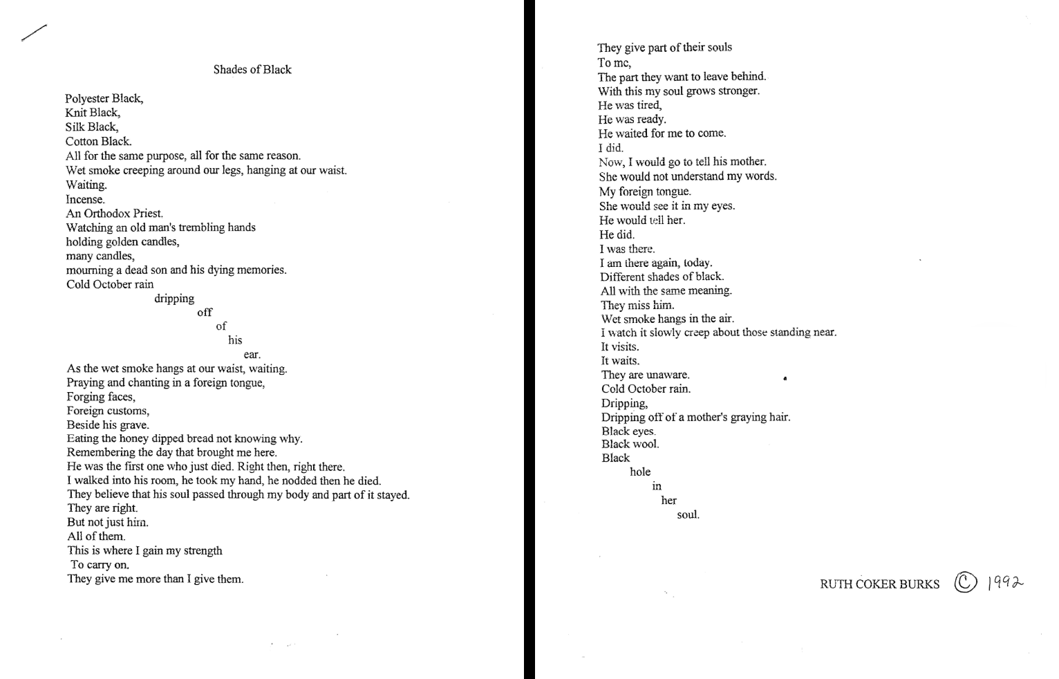 This sense of isolation is also represented in Ruth’s archival materials, for instance, in two poems she wrote in the early 1990s, “Shades of Black” and “THIRTYONE.” In writing about her first patient, Jimmy, in “Shades of Black,” the death Ruth recalls is sudden and lonely; there is only Ruth and a dying man crying out for his absent mother. Ruth went into the room alone, held this man’s hand, watched him die, and walked out of the hospital room alone. “Remembering the day that brought me here. He was the first one who just died. Right then, right there. I walked into his room, he took my hand, he nodded and then he died.”72See, Box 6, Folder 16, Ruth Coker Burks papers, Center for Arkansas History and Culture, Little Rock, Arkansas.