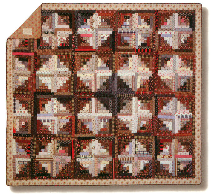 Rosa's Log Cabin incorporates a large number of different printed fabrics. The dark palette is limited primarily to shades of brown; the light fabrics include a variety of printed shirtings and dress fabrics. Quiltmakers often choose a single, bright fabric for the small center squares in all the blocks, but Rosa did not differentiate the center from the other dark fabrics. A single, narrow border of printed fabric frames the quilt, the edge is bound with alternating pieces of two different brown prints, and the fabric on the back is a lively printed stripe.